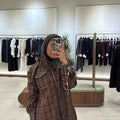 A brown checkered shirt-style jacket featuring a front zipper, chest pockets, and soft cuff details. Designed in a relaxed fit for effortless layering — perfect for casual autumn looks.