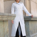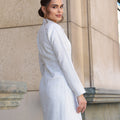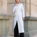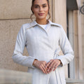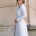 A long light grey wrap coat featuring a subtle textured fabric and a sleek tie detail at the waist.
