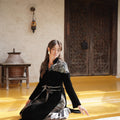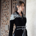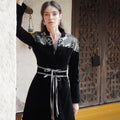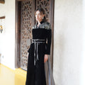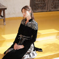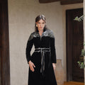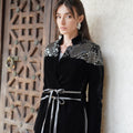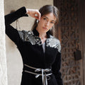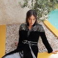 A black velvet Blazer style Kaftan with elegant embellished shoulder details and a soft waist tie that shapes the silhouette. Designed with a relaxed, flowing cut that combines traditional elegance with a modern touch.