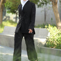 An elegant black two-piece set featuring delicate scattered embellishments and a wrap-style blazer with a soft waist tie. Paired with wide-leg pants, this design combines subtle sparkle with timeless tailoring.