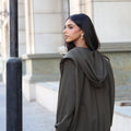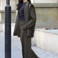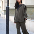 A relaxed matching set featuring a loose high-neck top with gathered shoulders and straight-leg pants — offering an effortless, modern silhouette with soft drape and comfort.